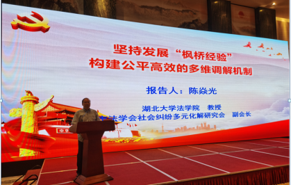 本次会议为落实贯彻武汉市委有关“加快探索超大城市现代化治理新路子”的重要精神,分析总结武汉市调解工作经验、深化理论研究、探索创新治理新理念、新模式,提高社会治理能力。陈焱光教授长期关注和研究市域社会治理理论和实践,本次大会交流,报告的题目是《坚持发展“枫桥经验” 构建公平高效的多维调解机制》,报告从新时代“枫桥经验”的武汉实践、当前调解机制存在的不足、构建公平高效的多维调解机制的建议等三个方面进行了汇报。报告认为武汉市在借鉴“枫桥经验”、经过不断创新实践,结合武汉经济地理、历史文化、革命文化、工业文化、商贸文化、科教文化等资源,探索超大城市社会治理之路,成功入选全国最平安城市、第一期全国市域社会治理现代化试点城市,初步构建起了以人民为中心、具有武汉特色的多元调解机制,但同时也面临城市快速发展和社会转型伴随的矛盾增多和更加复杂化等带来的诸多挑战,需要在发挥党统领全局、顶层设计的作用、建立政法机关统领和指导下不同调解方式的衔接协同机制、建立纠纷源头治理和调解的分类处置机制及程序制度、建立非常时期的应急调解机制、完善调解的制度保障、完善矛盾纠纷调解全过程监督机制、打造线上线下调解融合贯通的信息服务平台等制度与体制机制方面进一步加强和完善。