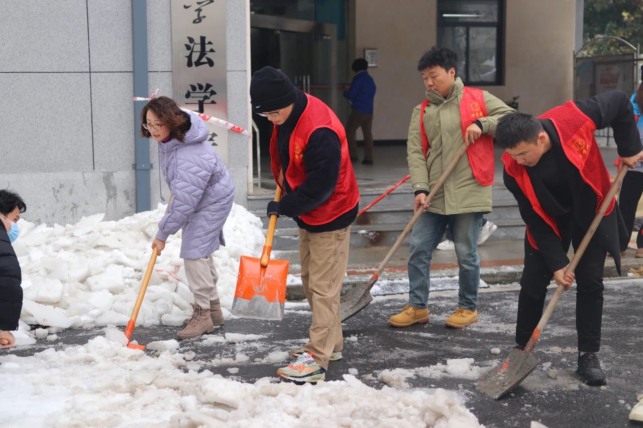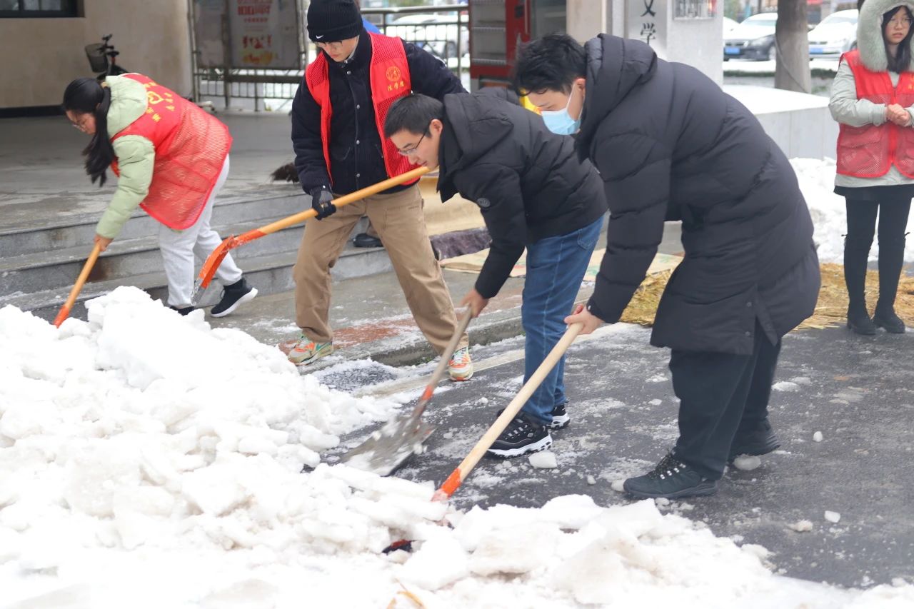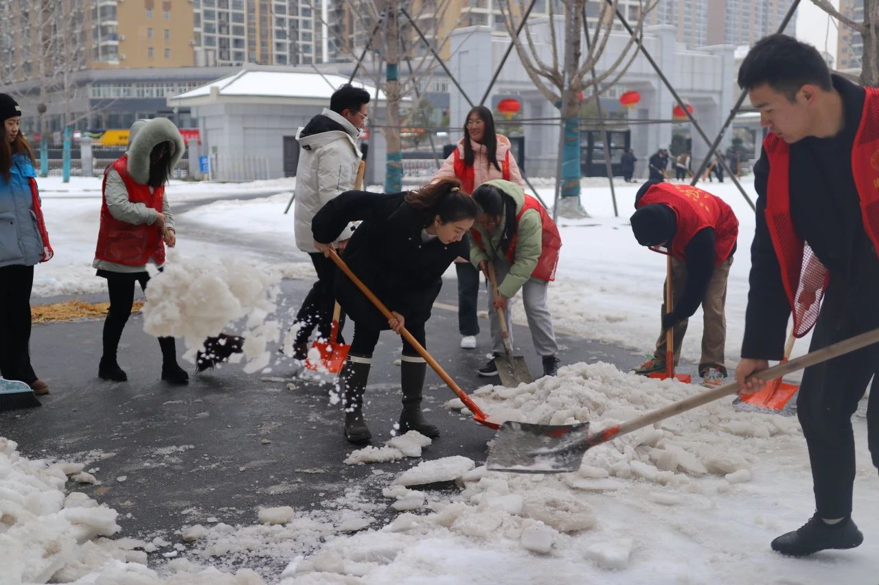 风雨送春归,飞雪迎春到。被冰雪夹霰洗礼后的太阳集团tyc33455银装素裹,校园道路上积雪深厚。随着新学期的来临,为确保校园安全有序,让师生们顺利返校,太阳集团tyc33455法公司党委副书记张梦婵、教师蔡大顺、张颖、袁子轩、肖普焮、团委书记郭童以及各位员工志愿者们积极地参与了此次扫冰除雪的活动。