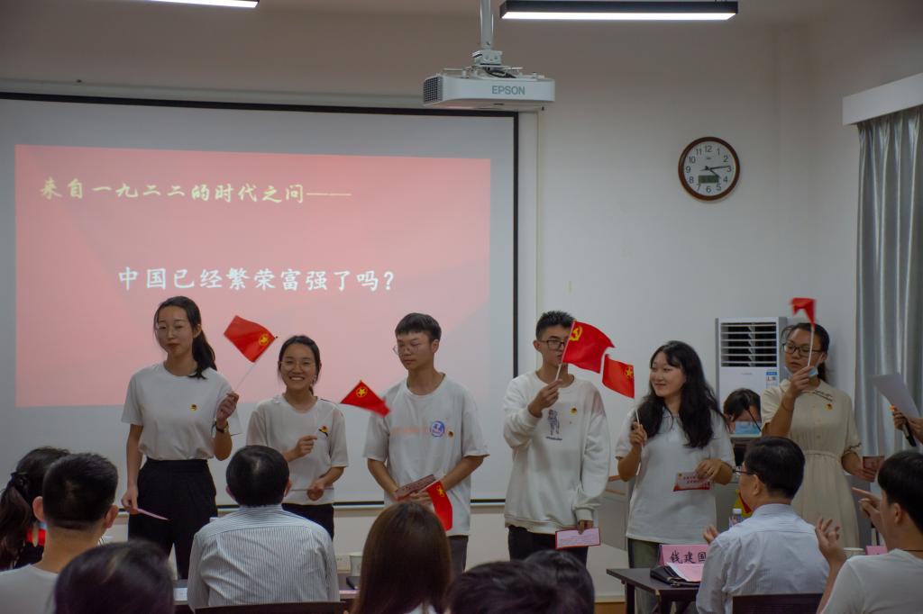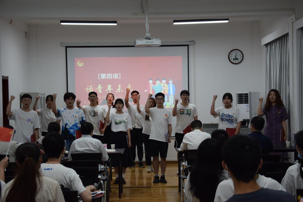 “我们是五月的花海,用青春拥抱时代......”活动在全体齐唱团歌声中拉开帷幕。全体青年团员面对鲜红团旗,庄严宣誓。团旗猎猎,誓言铮铮。2020级法学(卓越班)员工团员带来了互动情景剧《错位时空》,情景剧生动展现1919年“五四运动”时期青年员工为民族危亡奔走呼告的历史画面,以历史事件引发时代之问,以历史逻辑抒写历史感悟,2020级法学卓越班团支部面对“时代之问”,掷地有声做出了他们的青春之答。百年风云激荡,跨越错位时空,湖大学子、法学翘楚牢记党的教诲,立志民族复兴,勤奋学习,不负韶华。同学们认真学习习近平总书记在中国人民大学考察时的讲话,员工代表作了交流发言。大家回望百年历史,讲述青春故事,礼赞伟大祖国,团员代表诗歌朗诵—“请党放心,强国有我”并集体观看主题视频。