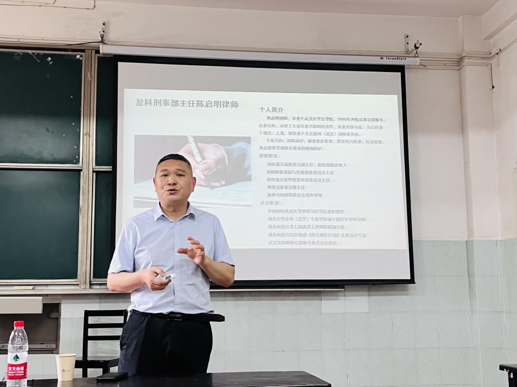 4月27日下午,北京盈科(武汉)律师事务所陈启明律师应邀来公司,为2021级法学硕士和2021级法律硕士带来了主题为《诈骗罪案例分析精选》的法律实务专题讲座。陈启明律师是公司聘请的法律专业学位硕士研究生校外合作导师,北京盈科(武汉)律师事务所高级合伙人、刑事法律事务部主任。太阳集团tyc33455副经理江岚副教授主持讲座。