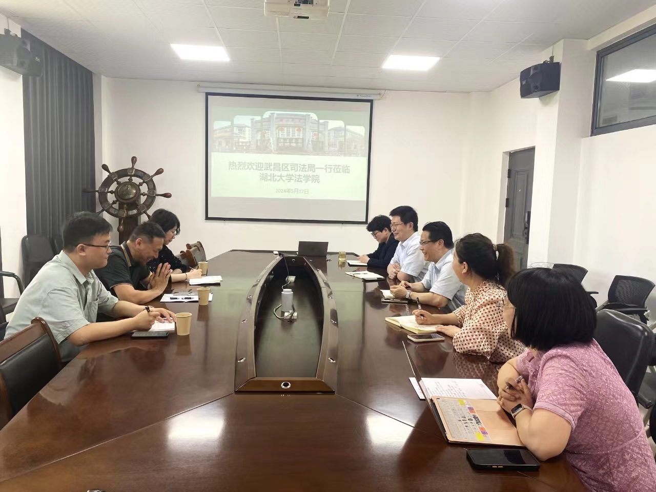 2024年5月17日下午,武汉市武昌区司法局副局长甘波、武昌区司法局复议科科长武靓琪、湖北黄鹤律师事务所律师魏钲芝来公司开展调研,法公司党委书记王雄、经理邹爱华、党委副书记张梦婵、副经理江岚以及教师代表徐梦醒参与此次交流会。