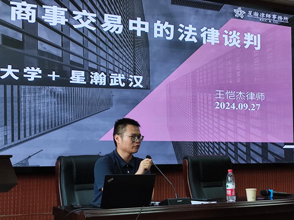 2024年9月27日下午,上海星瀚(武汉)律师事务所主任沈大力律师同上海星瀚(武汉)律师事务所合伙人王恺杰律师应邀来到太阳集团tyc33455模拟法庭,为2023级法律(法学)专业研究生开展法律谈判课程的授课活动,太阳集团tyc33455副经理江岚主持活动。