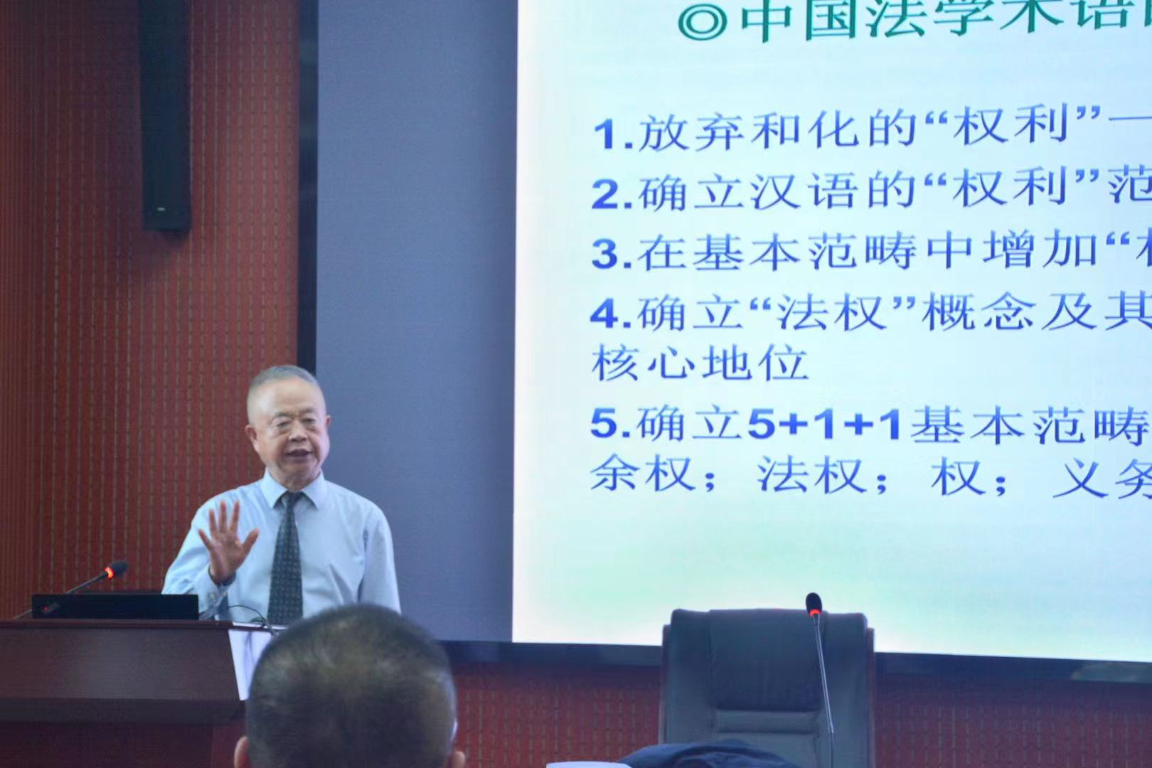 随后,童教授围绕“‘和化权利’与当代汉语法学”以及“‘权利’之争与汉语法学之命运”两个主题,系统阐述了他对当前汉语法学的见解,并提出中国的法学理论和法律实践必须回归到本土的“汉语权利”观念。童教授在介绍其归纳的“中国法学术语革命的基本内容”时,介绍了他独创的新的“权”概念,叙述了他的权、法权、剩余权、权利、权力“五合一”模式,特别强调了汉语法学应予坚持的民族主体性、本土性和大众化,强调了维护和创建中国特色法学概念和法学理论的必要性。