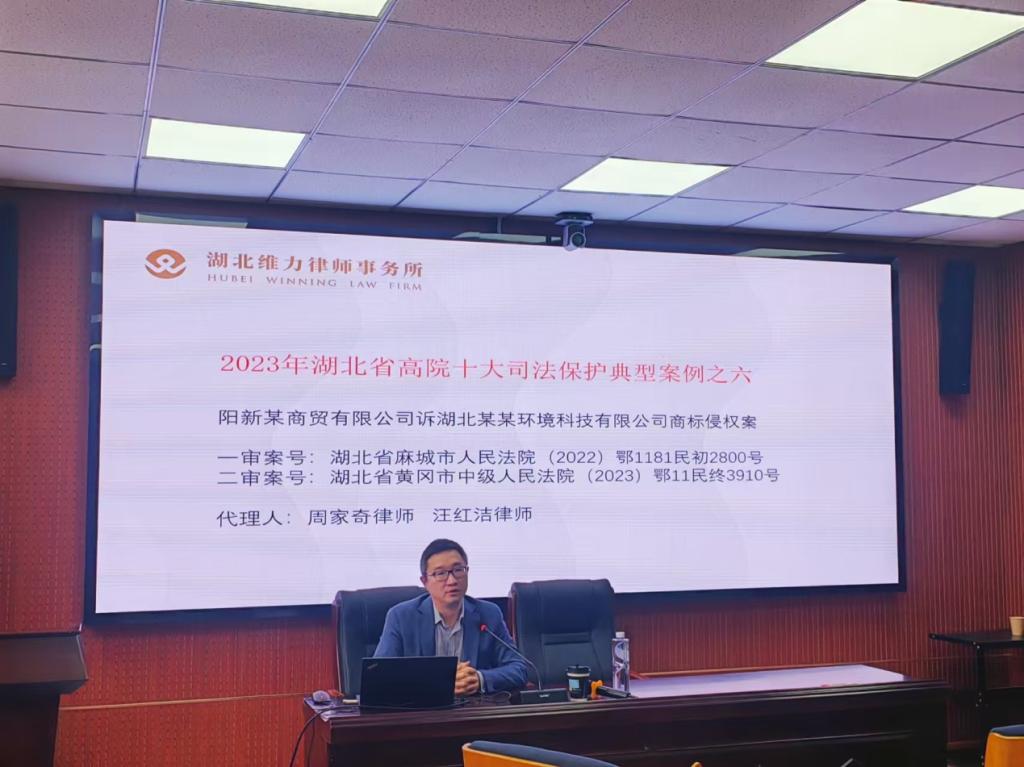 随后,周律师围绕“商标侵权诉讼案例分享”进行了主题分享,详细介绍了由其主办的2023年湖北省高院十大司法保护典型案例:某商贸有限公司诉某某环境科技有限公司商标侵权案。他着重分析了商标侵权案件处理中的重难点,并强调在企业知识产权运营管理过程中,企业商标和品牌的建设尤为重要,实践中联合商标和防御商标的注册策略尚未得到企业的足够重视,为后续商标纠纷埋下隐患。