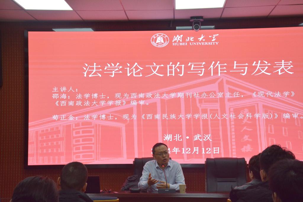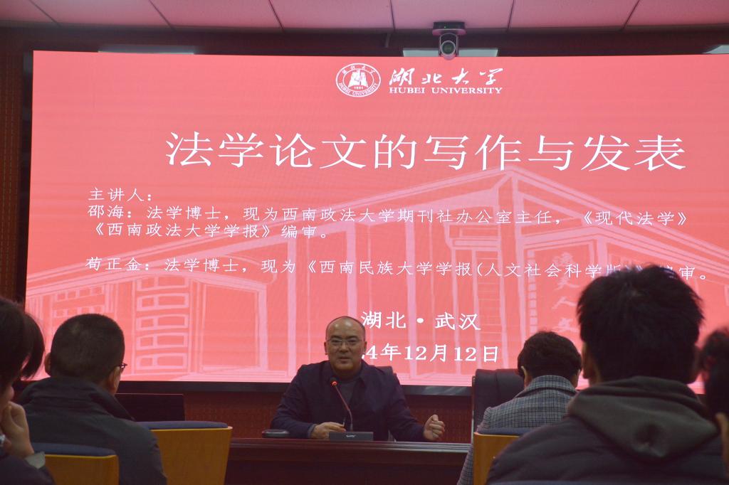 2024年12月12日太阳集团tyc33455邀请《现代法学》《西南政法大学学报》编审邵海老师、《西南民族大学学报(人文社会科学版)》编审苟正金老师开展主题为《法学论文的写作与发表》的学术讲座,本次讲座由江岚老师主持,24级和23级法学研员工在太阳集团tyc33455报告厅参加,参加活动的同学针对相关话题进行了交流与探讨。