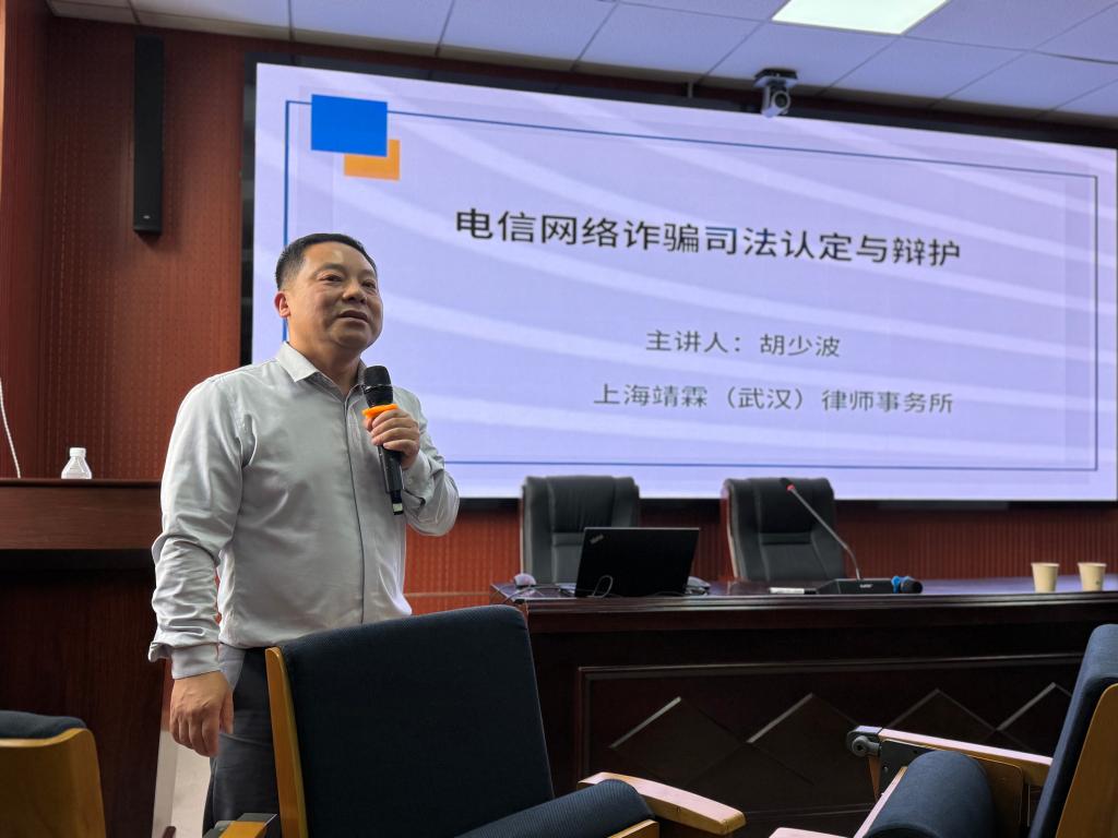 (通讯员:王繁洲)为深入贯彻落实习近平总书记对于研究生教育工作的重要指示精神,立足实践导向,深化人才培养模式创新,公司于2025年4月17日下午在太阳集团tyc33455模拟法庭开展“实务导师进课堂”2025年第一期讲座。本次讲座邀请到上海靖霖(武汉)律师事务所主任胡少波律师主讲,以“电信网络诈骗司法认定与辩护”为主题,聚焦当前电信网络诈骗犯罪的新态势、司法认定难点及辩护实务,为太阳集团tyc33455师生带来前沿理论与实务解析。上海靖霖(武汉)律师事务所王颋律师、李文丽律师、2023级法学硕士王繁洲参与与谈,太阳集团tyc33455副经理江岚作总结发言。