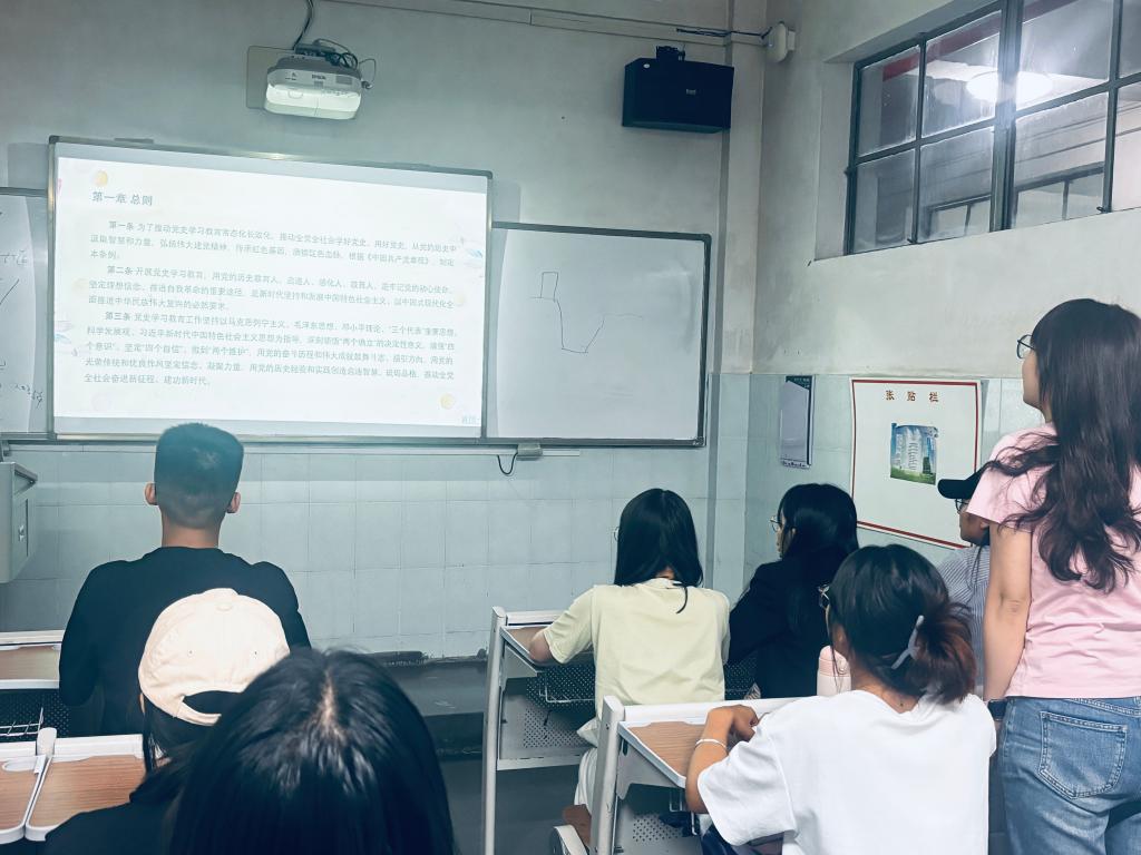 接下来,陈佩雯同志开展党史学习教育。党史学习教育,充分发挥党史以史鉴今、资政育人的作用,是党和国家工作大局中的一件十分重要的工作。《党史学习教育工作条例》总共分为六章:第一章总则、第二章领导体制和工作职责、第三章党史学习教育的内容、第四章党史学习教育的主要方式、第五章保障和监督、第六章附则,《条例》以习近平新时代中国特色社会主义思想为指导,以党章为根本依据,对党史学习教育的领导体制和工作职责、内容、主要形式、保障和监督等作出全面规范,是开展党史学习教育工作的基本遵循。《条例》的制定和实施,对于推动党史学习教育常态化长效化,推动全党全社会学好党史、用好党史,从党的历史中汲取智慧和力量,做到学史明理、学史增信、学史崇德、学史力行,具有重要意义会议结束后,与会的同学都积极发表了自己对加强党的纪律建设的所思所想。(审核人:王雄)